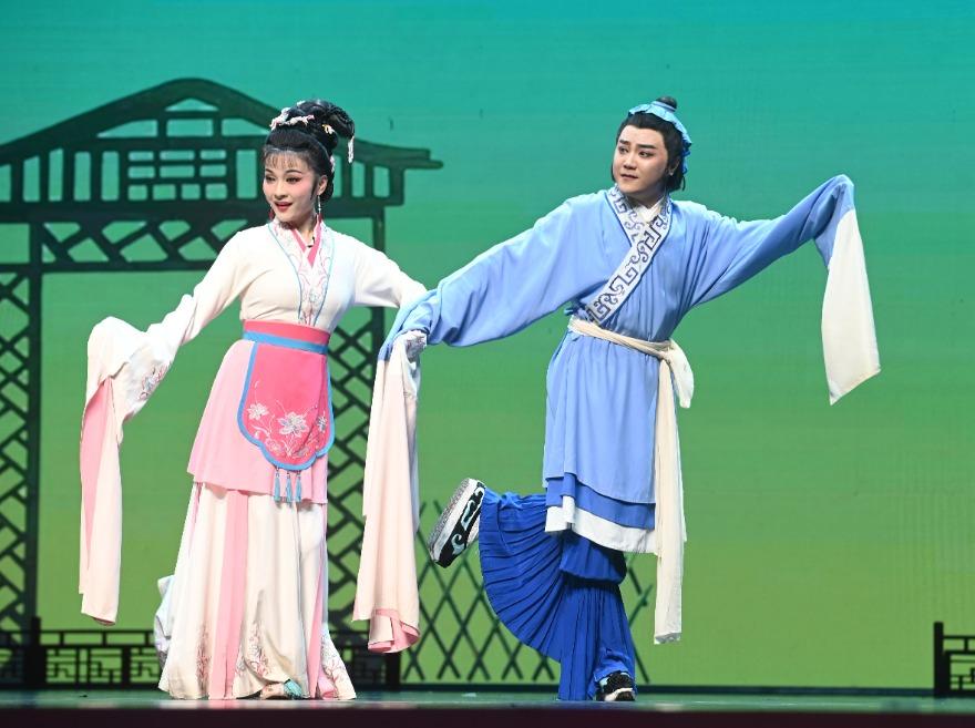 安徽省黄梅戏剧院演员王莹、徐镭洋在表演黄梅戏《天仙配》选段