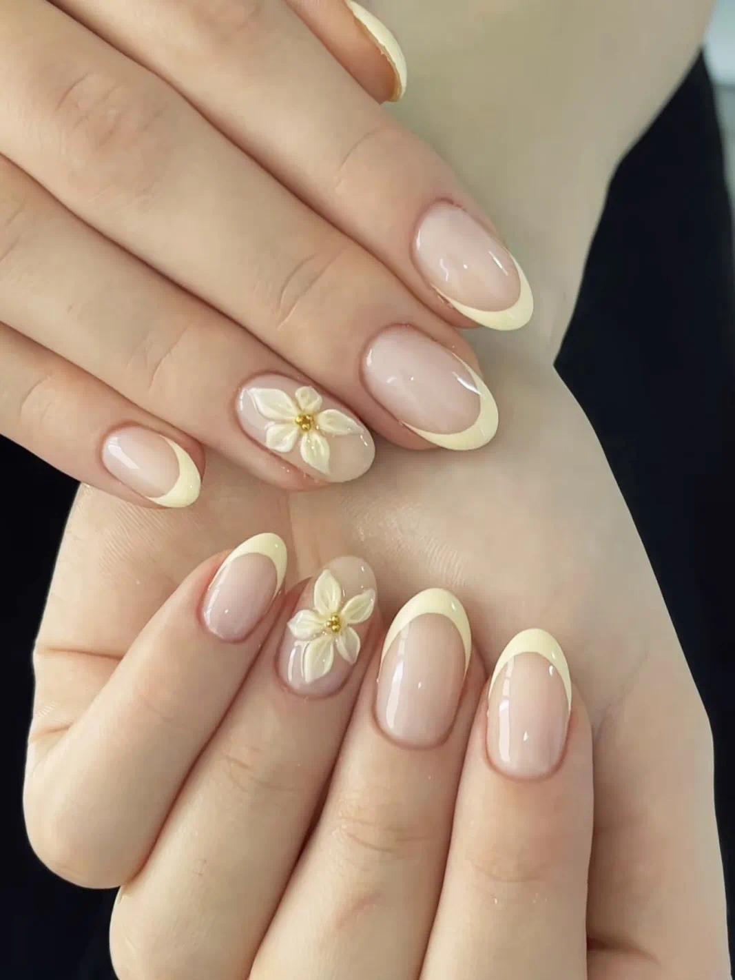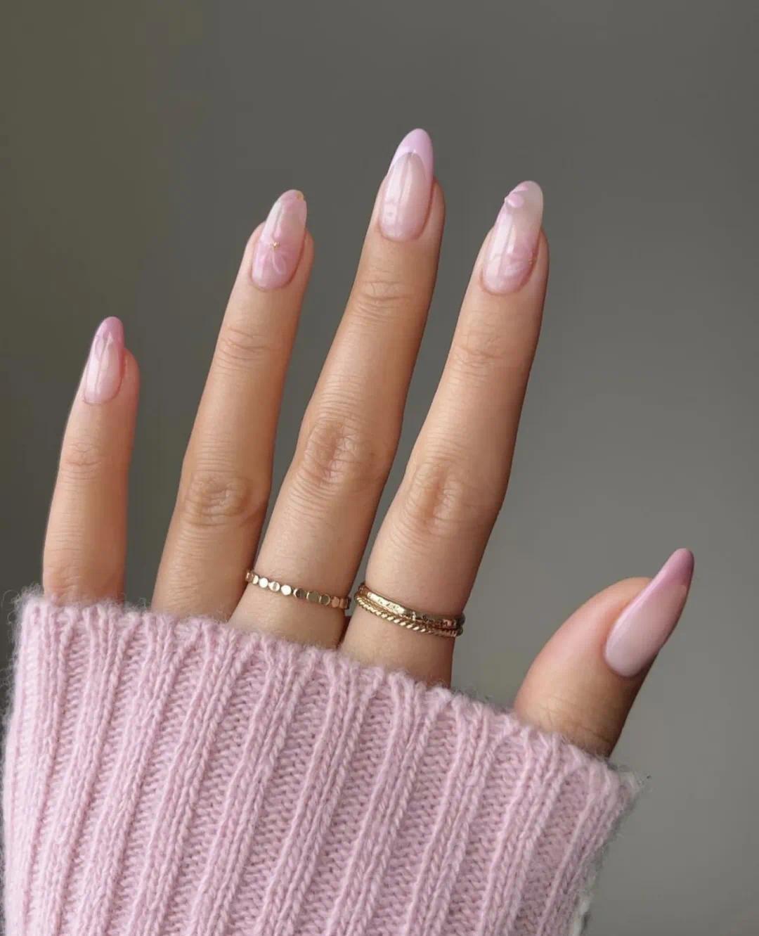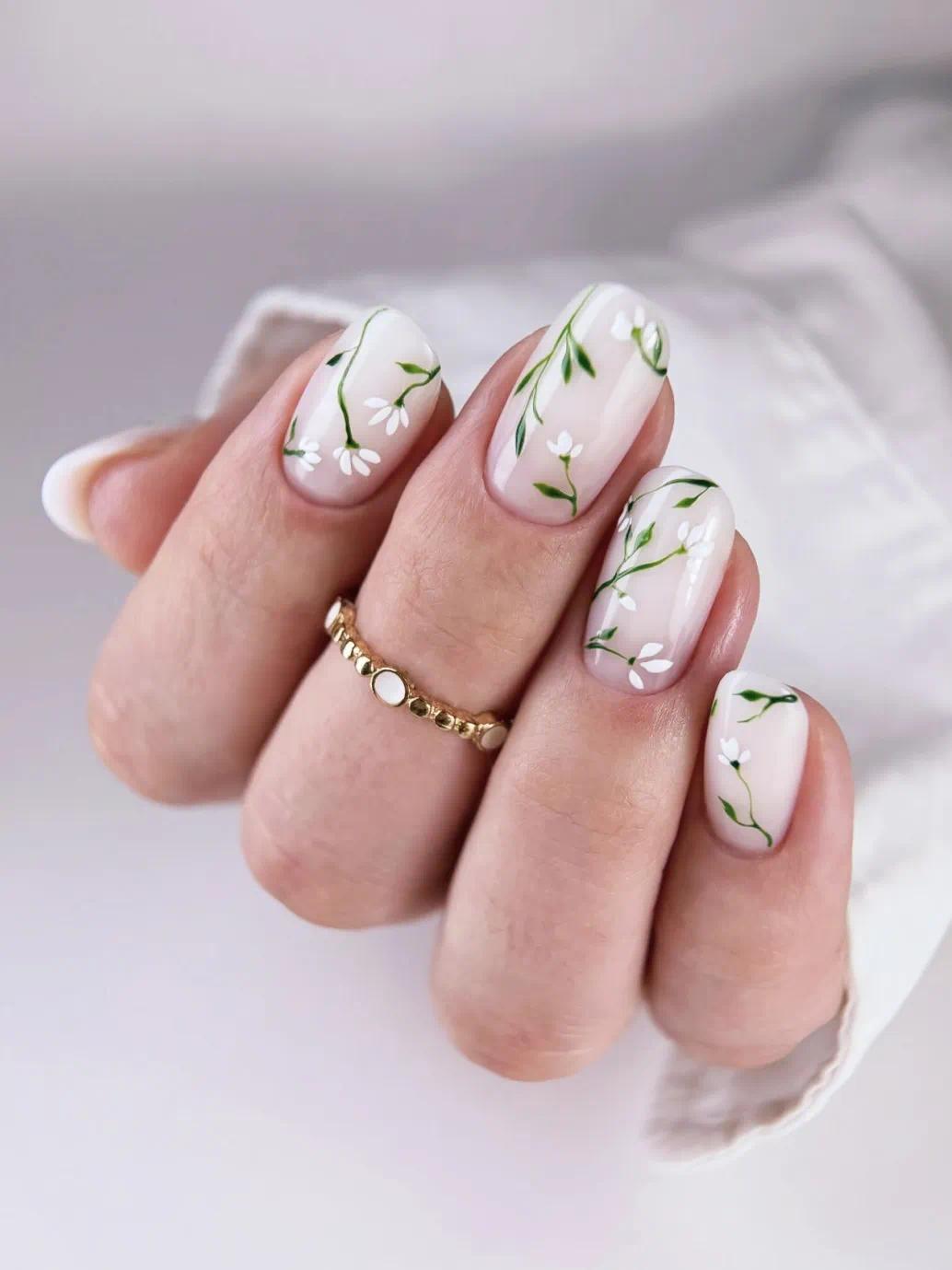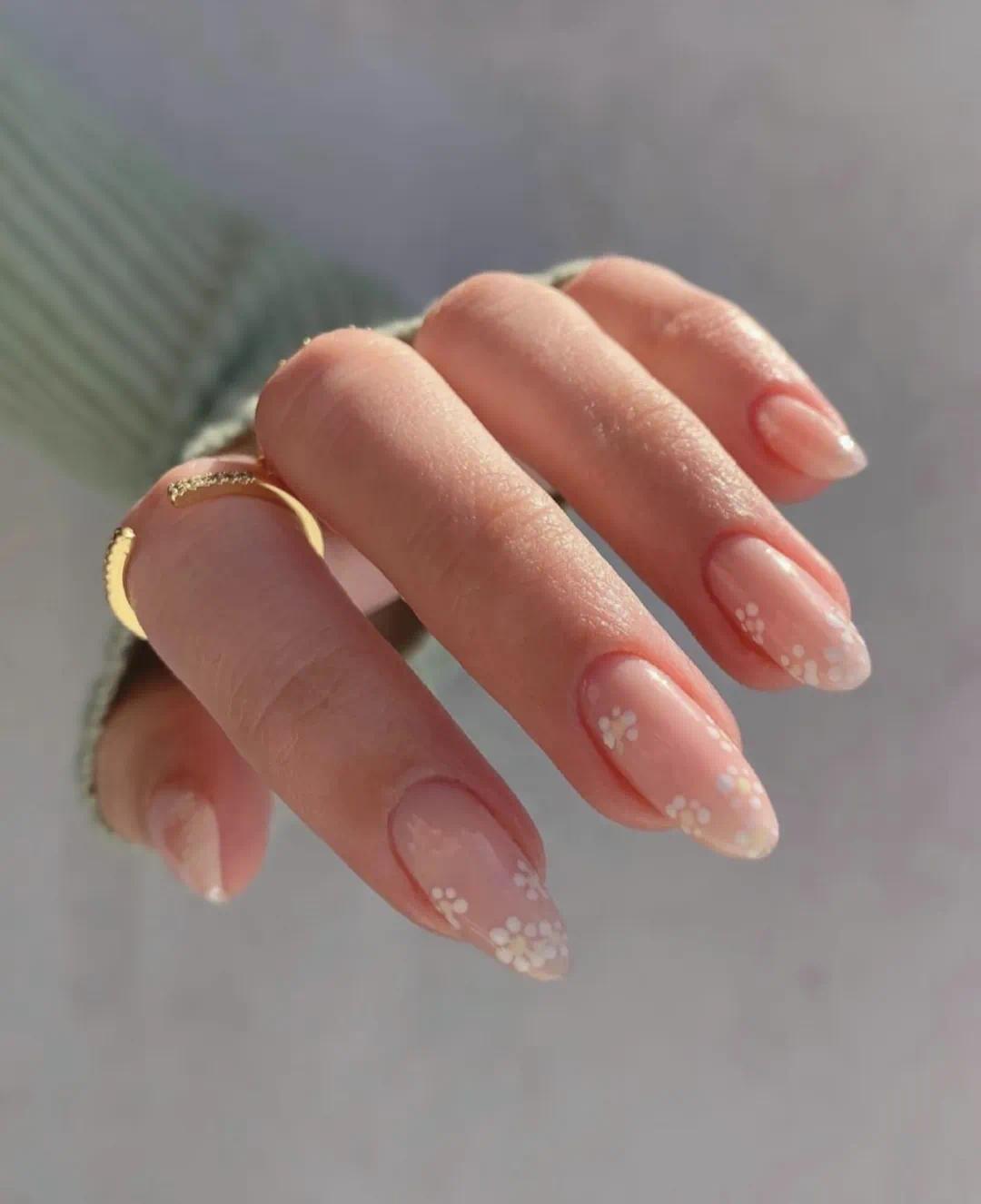 除了低饱和淡粉和白开水美甲,同样适合这个春天的,还有自带氛围感的淡雅花卉美甲。