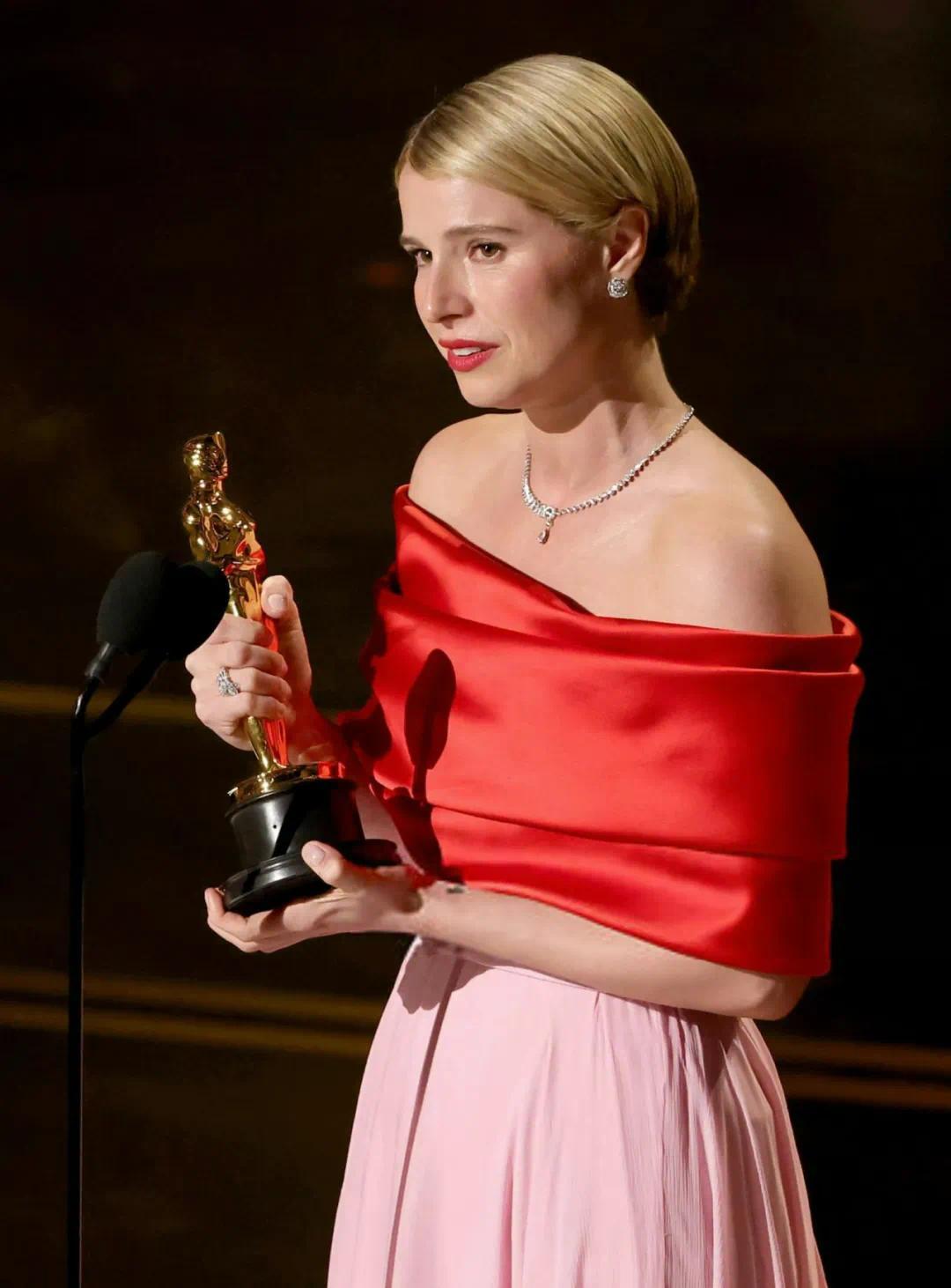 新一届影后杰西・巴克利,捧起奖杯的时候就是裸调淡粉美甲入镜,搭配香奈儿红粉拼接高定礼服,哑光柔粉不抢礼服风头,镜头里干净又高级。