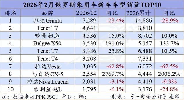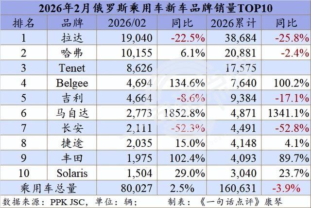 根据PPK JSC公布的数据,虽然整体车市在低基数上重回增长,但2月俄罗斯乘用车品牌销量十强中只有6家同比为正,Tenet因进入该市场不足一年没有同比数据,拉达、吉利和长安都继续下跌。